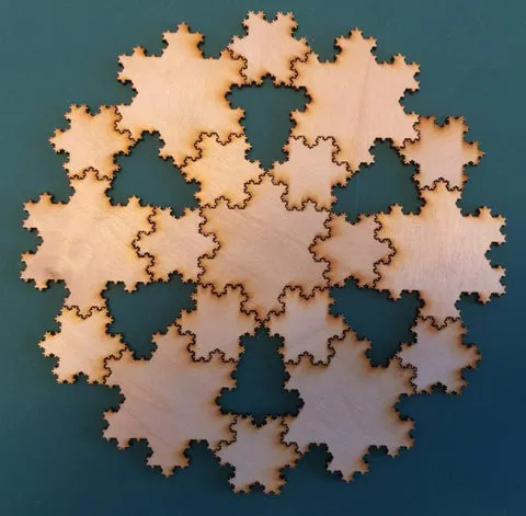 Like other fractal curves, it has an infinitely long boundary, and the self-similarity is obvious as you zoom in. One of the cool things about the Koch snowflake is that it can be built from six smaller snowflakes, leaving another snowflake in the middle. That of course can also be decomposed, recursively, giving you this: